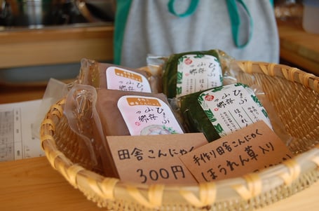 加工品も売っておられました。写真のこんにゃくは、曽爾村の地域イノベーションプロジェクトの1つで長野地区の「びょうぶ山桜の郷」が作られた無農薬こんにゃくです。おみやげに買った手作りの串こんにゃくは、プリっとしているけどやわらかくて味が染みていて子供たちに大人気で「また買ってきて~」と頼まれました!